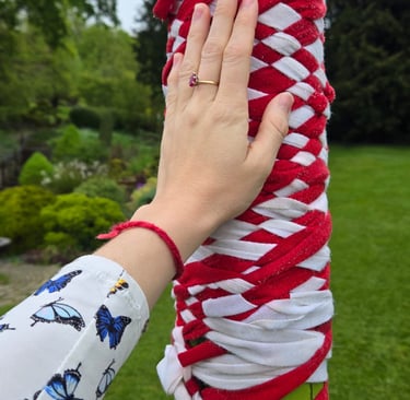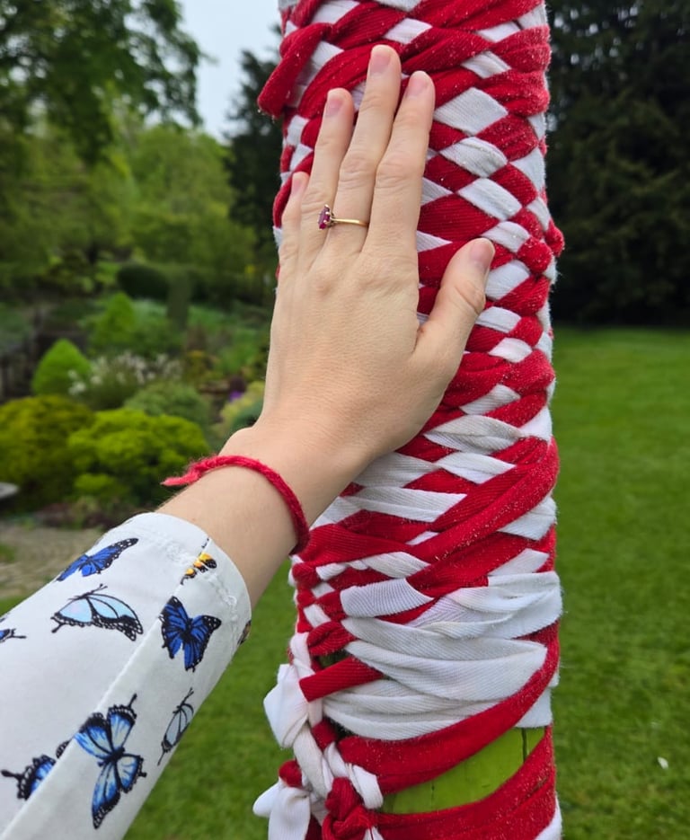 The Maypole, wrapped in white and red promised fertility.